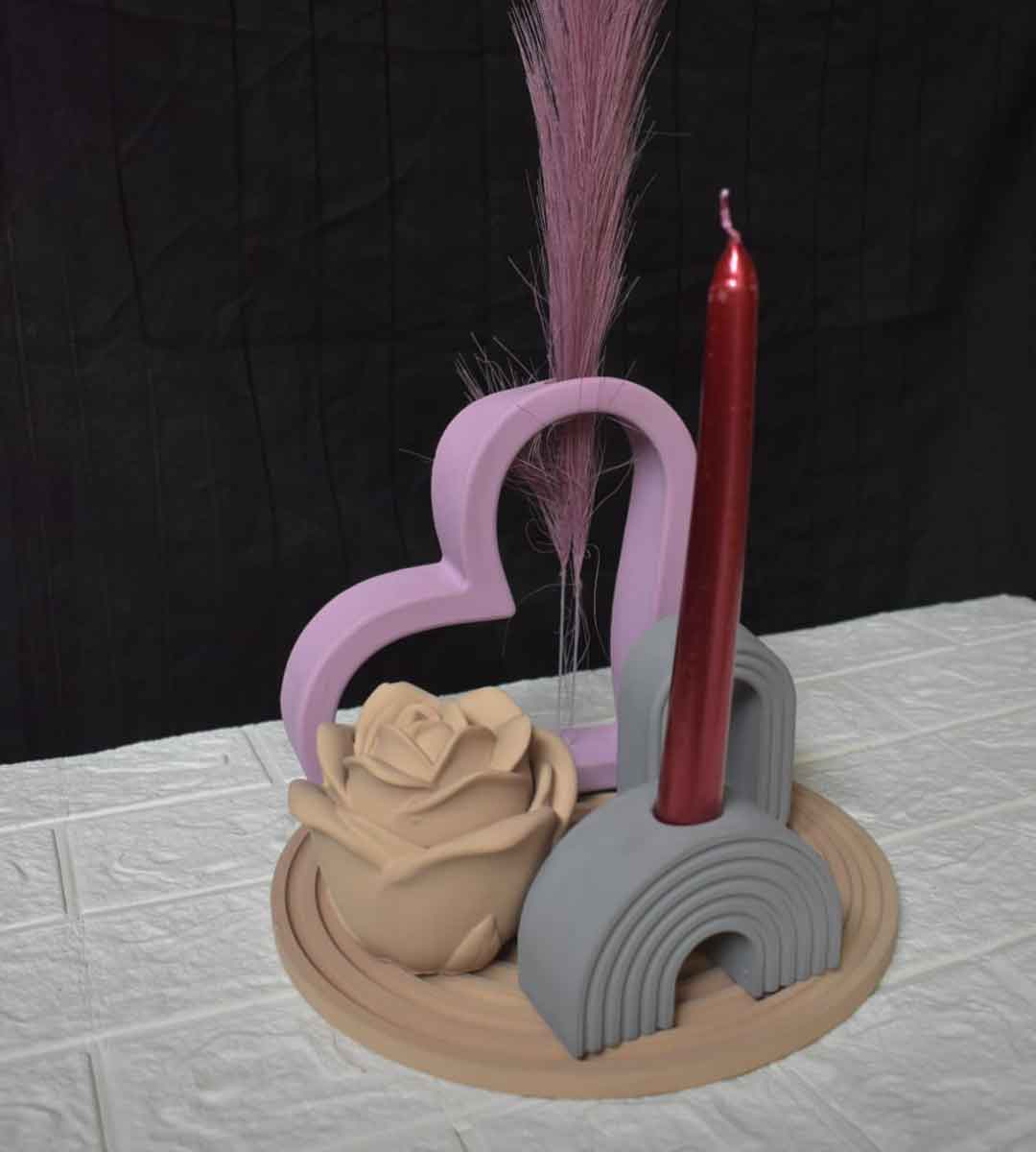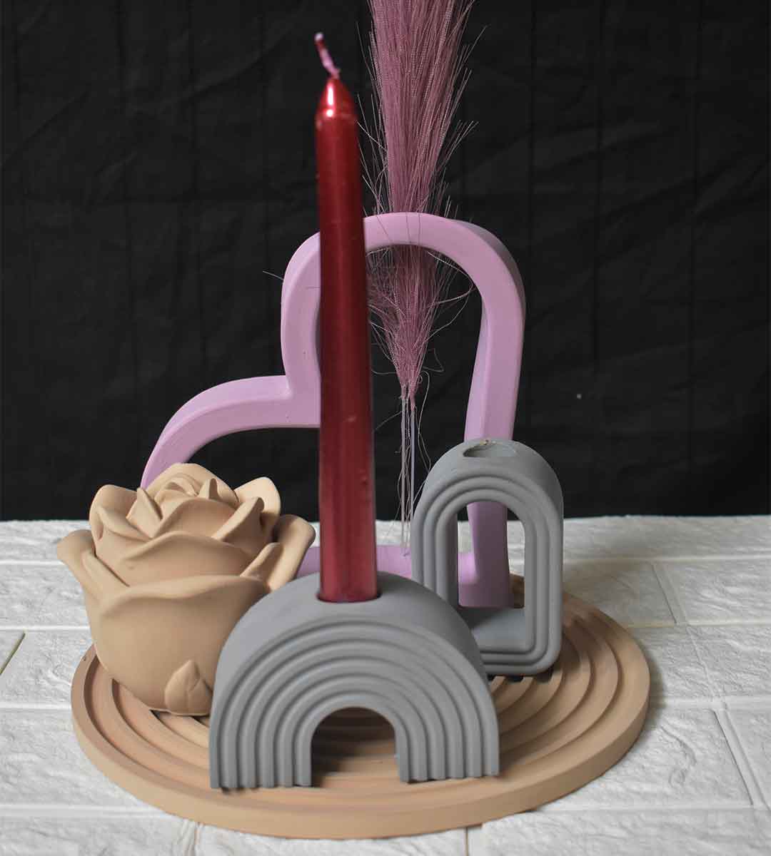 This stunning arrangement features a matte grey arch candle holder, a bold red taper candle, a sculpted rose accent, and a pastel heart frame paired with delicate dried florals. All items sit beautifully on a neutral-toned round base, creating the perfect blend of elegance, modern aesthetics, and romantic charm.