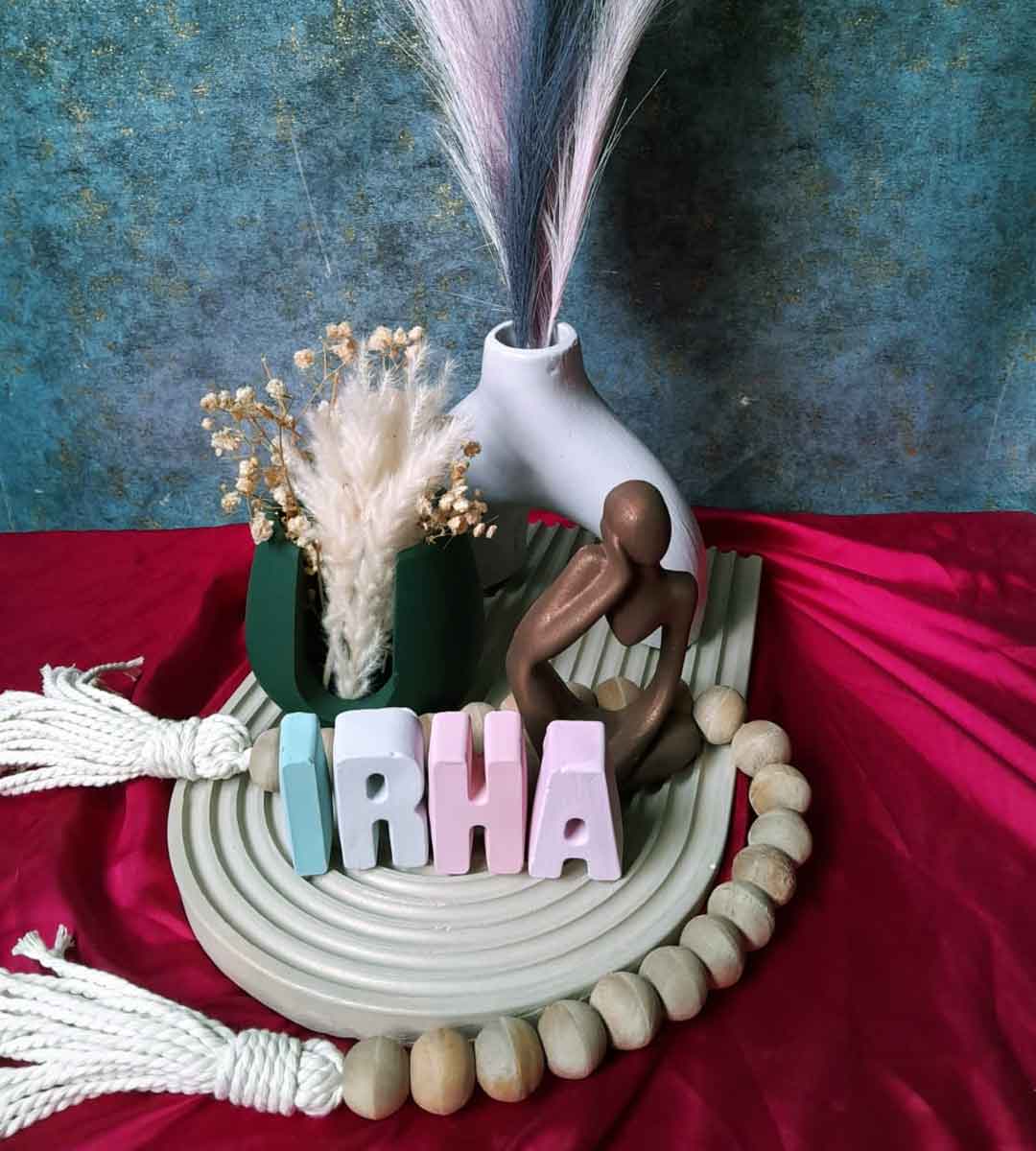 Crafted with love, the IRHA Signature Decor Set celebrates individuality and charm. Featuring custom pastel letter blocks, dried blooms, and modern sculpture art, it’s the perfect blend of personal and chic. Whether for your own home or as a thoughtful gift, this set adds meaning to every detail.